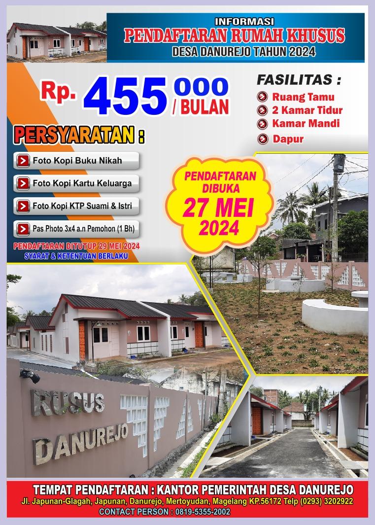 Di Informasikan kepada Seluruh Warga Masyarakat Desa Danurejo, ada kesempatan untuk mendaftarkan diri menghuni Rusus Desa Danurejo yang berlokasi di Dusun Telukan Danurejo Mertoyudan Magelang. Adapun keterangan lebih lanjut dapat dilihat pada Informasi berikut